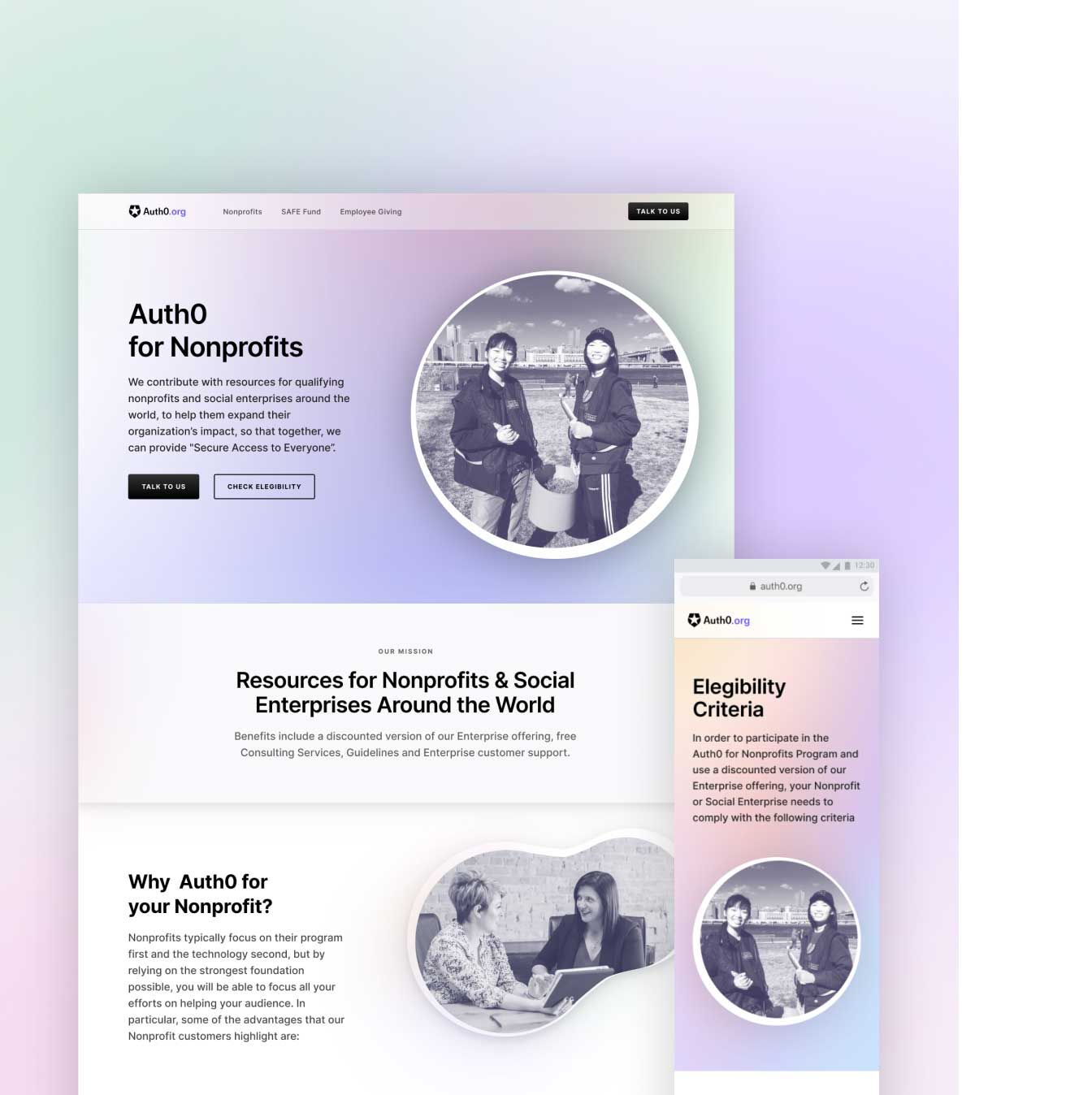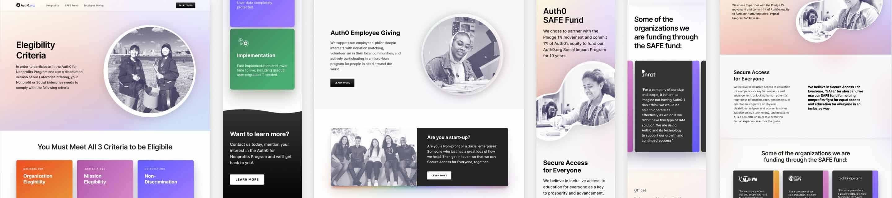 In order to allocate part of their equity to nonprofit organizations, Auth0 partnered with the Pledge 1% movement. This action formalized their social impact project with the Auth0 SAFE Fund. Our job during this project was to find a distinguishable look & feel for this program's landing page, in between the Auth0 brand.